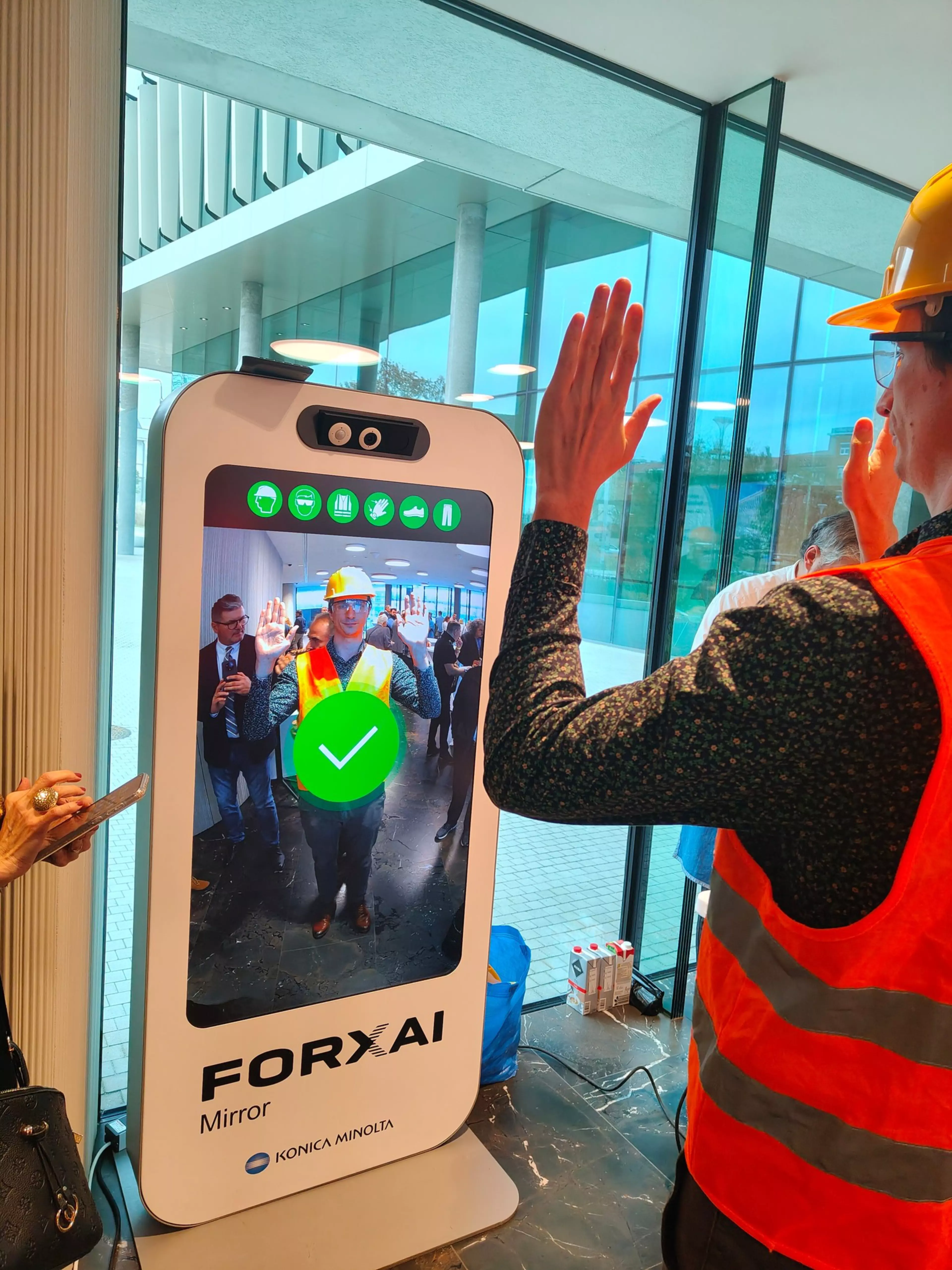 A résztvevő EHS vezetők és szakemberek élőben is megismerhették a FORXAI Mirror rendszert – az AI-alapú berendezést, amely automatikusan detektálja és dokumentálja az egyéni védőfelszerelések (PPE) viselését.